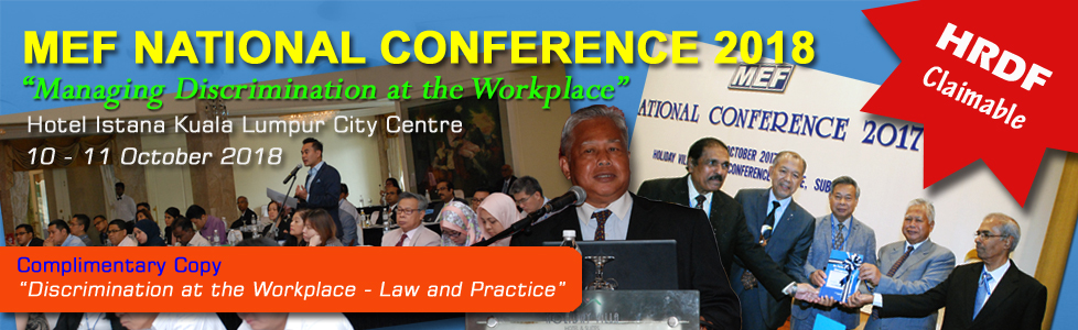 The theme of the Conference, “Managing Discrimination at the Workplace”, addresses the issues and challenges outlined in the complimentary MEF publication on ‘Discrimination at the Workplace – Law and Practice.' The Conference outlines policies and workable reporting mechanisms to encourage employees to report discriminatory or harassing conduct through appropriate channels, the employer's investigation procedures and confidentiality. Of particular interest would be the panel discussions on Equal Opportunity in Employment, and the issues and challenges on the proposed new policies on Reference to Industrial Court and Claim for Recognition.